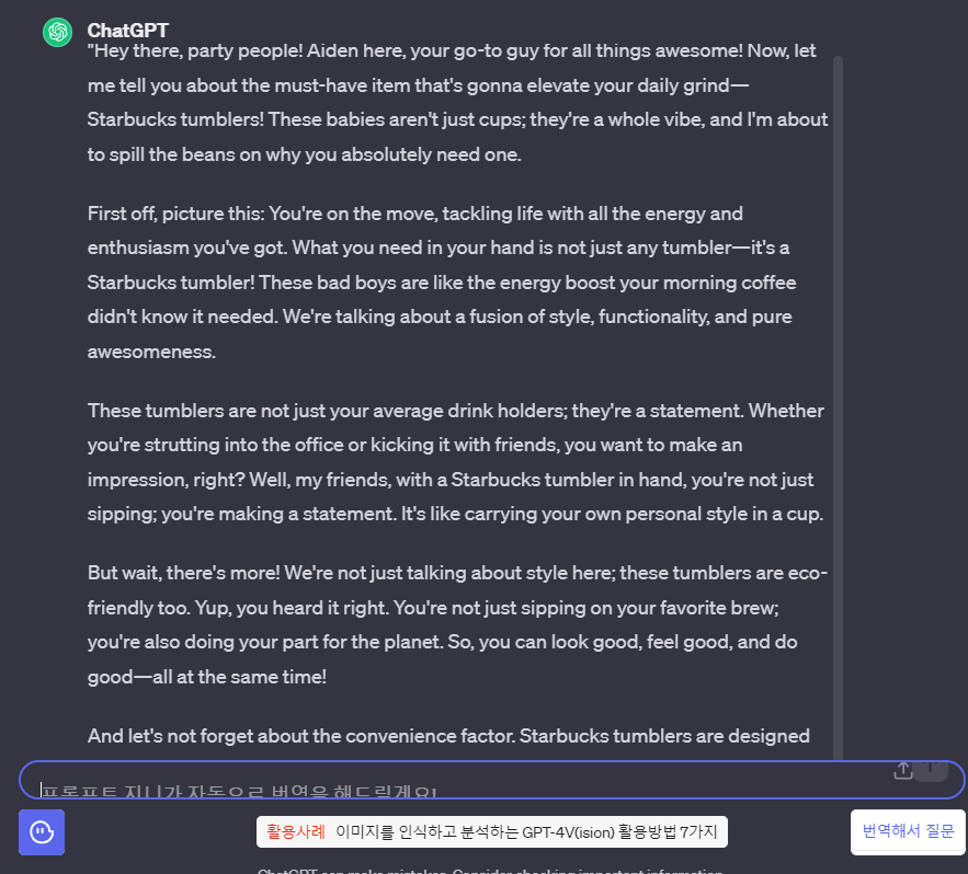 "파티에 오신 여러분, 안녕하세요! 멋진 모든 것을 도와드리는 에이든입니다! 이제 여러분의 일상을 한층 더 업그레이드해줄 필수 아이템, 스타벅스 텀블러에 대해 말씀드리겠습니다! 이 텀블러는 단순한 컵이 아니라 분위기 그 자체이며, 텀블러가 꼭 필요한 이유에 대해 자세히 설명해드리려고 합니다.