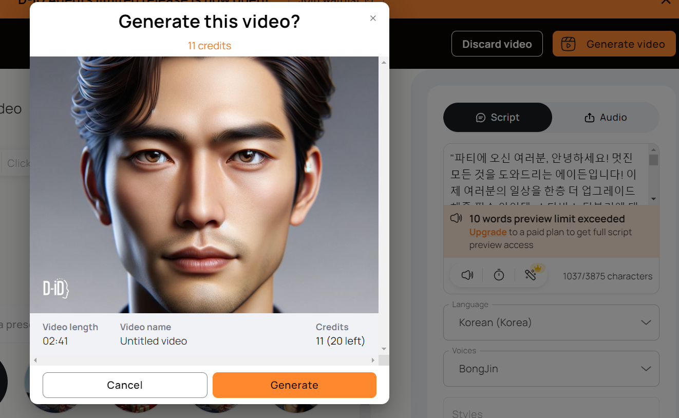아래는 D-ID 에서 영상을 만드는 과정 및 소요 토큰이다.